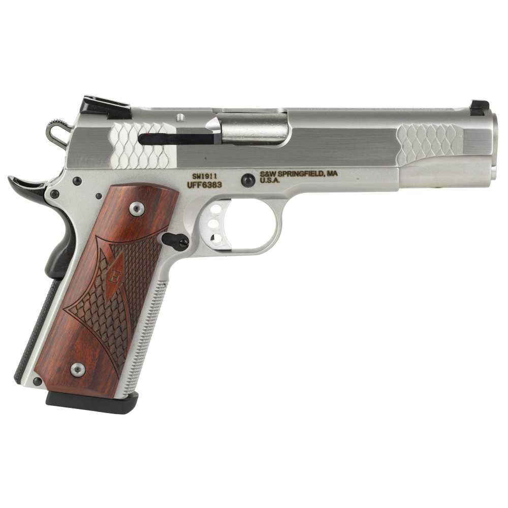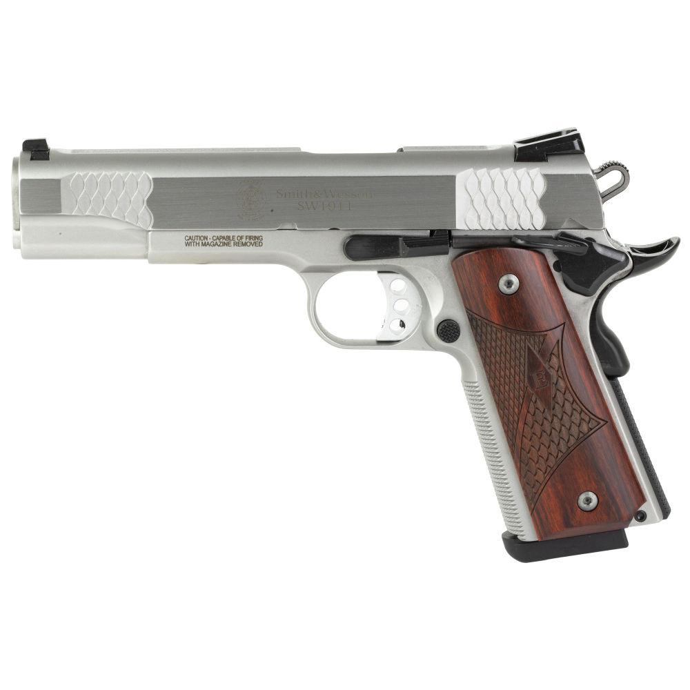 Smith & Wesson Law Enf SW1911, "E" Series, Single Action Only, Semi-automatic, Metal Frame Pistol, Full Size, 45 ACP, 5" Barrel, Stainless Steel, Wooden Laminate E-Series Grips, Manual Thumb Safety, 8 Rounds 13921