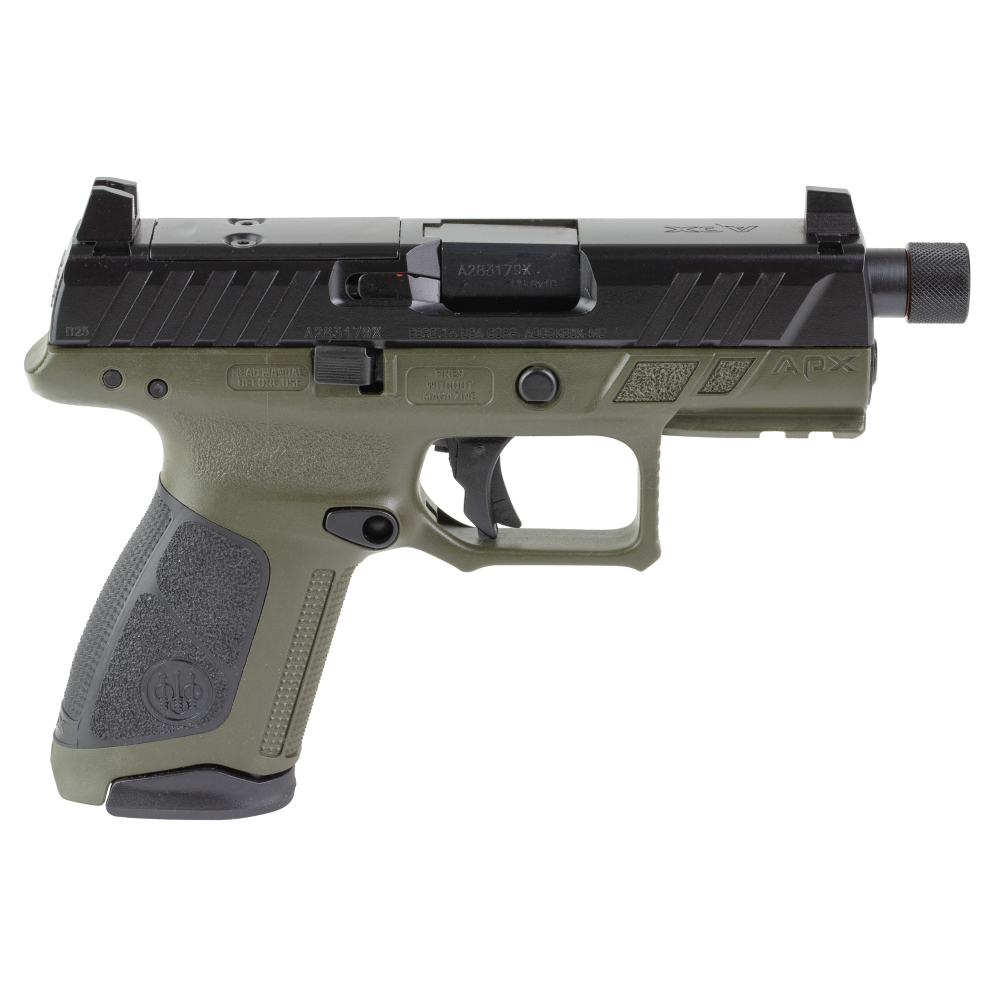 Beretta APX A1 Tactical, Striker Fired, Semi-automatic, Polymer Frame Pistol, Compact, 9MM, 4.2" Threaded Barrel 1/2X28, Matte Finish, Black Slide, Olive Drab Green Frame, Optics Ready, Trigger Safety, Blackout Suppressor Height Sights, 17 Rounds, 3 Magazines JAXA1C917TAC