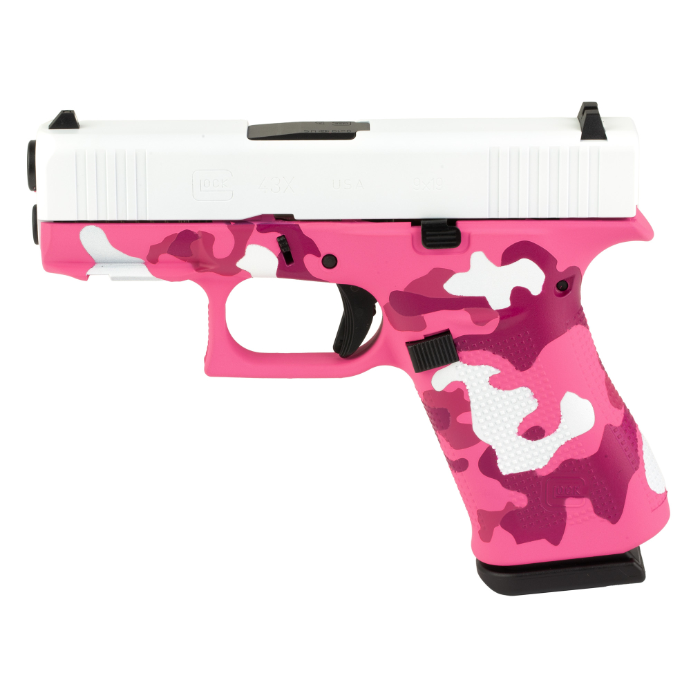 GLOCK 43X, Striker Fired, Semi-automatic, Polymer Frame Pistol, Sub-Compact, 9MM, 3.41" Barrel, Skydas Cerakote Finish, Custom Pink Commando Camo Cerakote Finish by Skydas, Fixed Sights, 10 Rounds, 2 Magazines UX4350204FRNPINKSKY