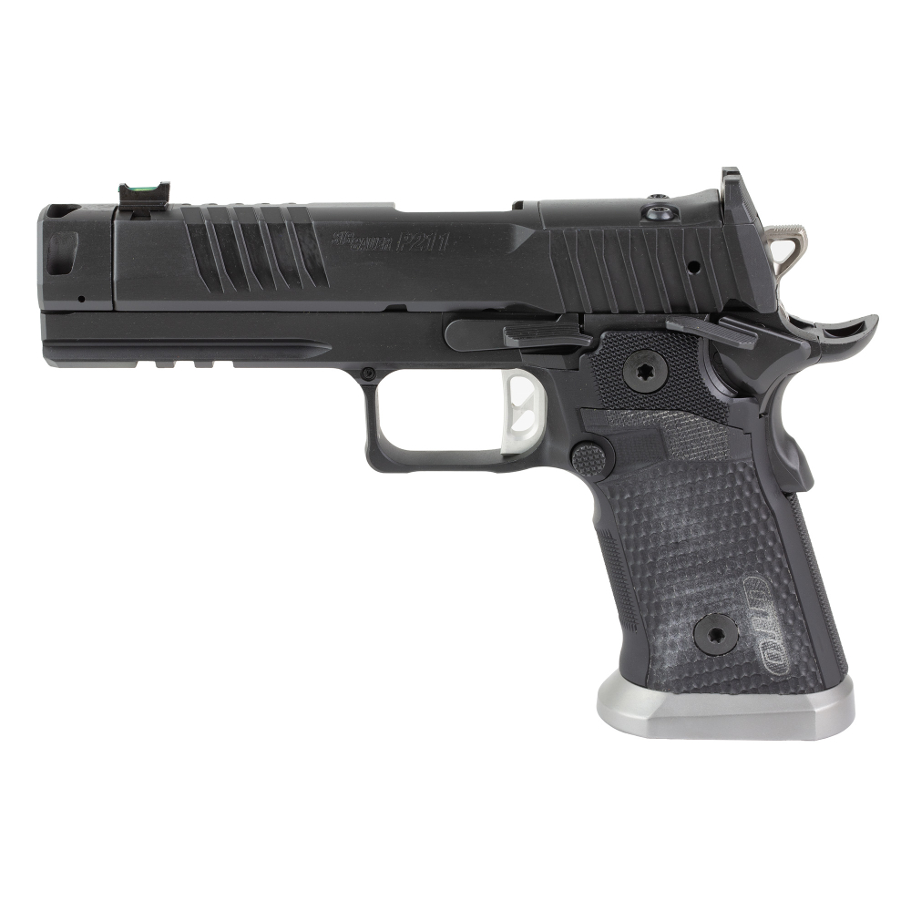 Sig Sauer P211, Semi-automatic, Single Action Only, Metal Frame Pistol, Full Size, 9MM, 4.4" Barrel, MACH3D Compensator, Matte Finish, Black, Sig-Loc Pro Footprint Optics Ready Slide, Fiber Optic Sight, Flared Magwell, 3 Magazines, 10 Rounds 211F-9-GTO-10