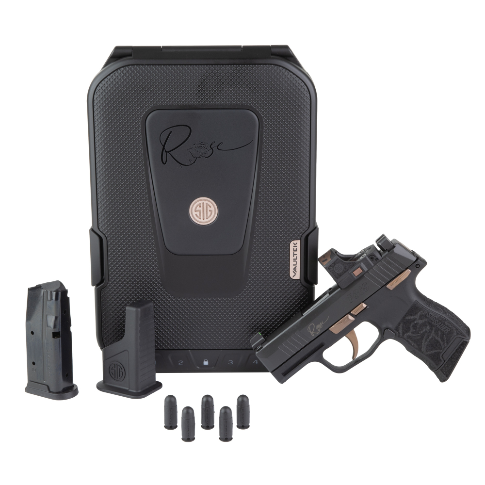 Sig Sauer P365 ROSE, Semi-automatic, Striker Fired, Polymer Frame Pistol, Sub-compact, 380 ACP, 3.1" Barrel, Nitron Finish, Black, Rose Gold Accents, ROMEO-RS Sight, X-RAY3 Day/Night Suppressor Height Sights, Polymer Grips, Manual Safety, 10 Rounds, 2 Magazines 365-380-ROSE-MS-RS