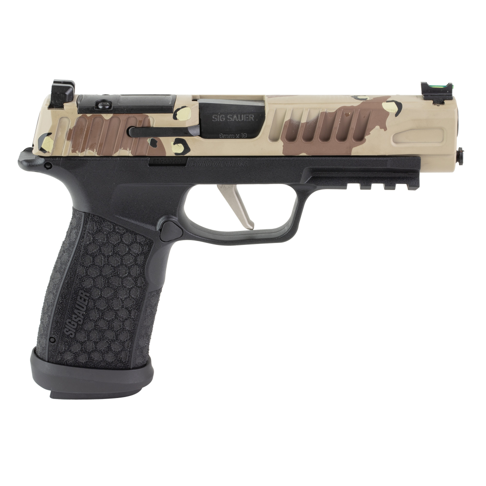 Sig Sauer P365 Fuse, Semi-automatic, Polymer Frame Pistol, Compact, 9MM, 4.3" Barrel, Custom Chocolate Chip DS Camo Cerakote Finish by Skydas, Sig Sauer LXG Grip, Fiber Optic Front and Low Profile Combat Rear Sights, 3 Magazines, (2)-21 Round Magazines and (1)-17 Round Magazine 365XF9BFO-DSCAMOSKY