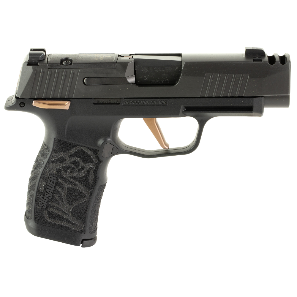 Sig Sauer P365XL Rose, Striker Fired, Semi-automatic, Polymer Frame Pistol, Sub-Compact, 9mm, 3.1" Barrel with Integrally Compensated Slide, Nitron Finish, Black with Rose Gold Controls and Engraving, SIGLITE Day/Night Sights, 10 Rounds, 2 Magazines, Optics Ready, Includes Rose Laser Engraved Grip Module, Rose Kit Including Vaultek Lifepod Pistol Safe, Dummy Rounds, and Quick Start Guide, California Compliant 365XL-9-ROSE-MS-CA