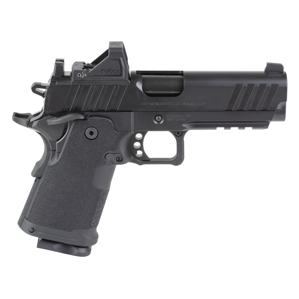 Springfield 1911 DS Prodigy Compact, Semi-automatic, Metal Frame Pistol, 4.25" Stainless Steel Barrel, Aluminum Alloy Frame, Cerakote Finish, Black, Optics Ready, Front White Dot Sight, Viridian Green Dot, 4 Magazines, 15 Rounds, Includes Range Bag PH9116AOS-PAC