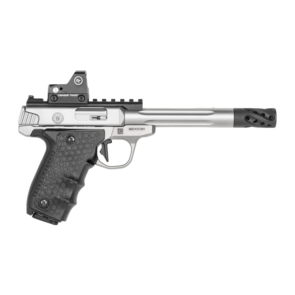 Smith & Wesson SW22 Victory, Target, Performance Center, Single Action Only, Semi-Automatic, Metal Frame Pistol, Full Size, 22LR, 6" Target Fluted Barrel, Muzzle Brake, Stainless Steel, Glass Bead Finish, Tandemkross hiveGrips with Target Thumbrest Grip, Manual Thumb Safety, 10 Rounds, 6 MOA Red Dot Sight, 2 Magazines 12079