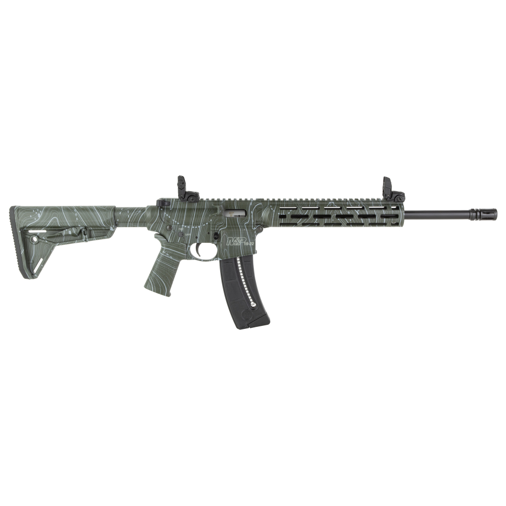 Smith & Wesson M&P 15-22 Sport, Blowback Semi-automatic Rifle, AR, 22LR, 16.5" Threaded Barrel, A2 Flash Suppressor, Olive Drab Green Cerakote, Topographical Finish, Magpul MOE SL Stock and Grip, Slim Polymer Handguard with M-LOK Slots, Magpul MBUS Sights, 25 Rounds, 1 Magazine 14469