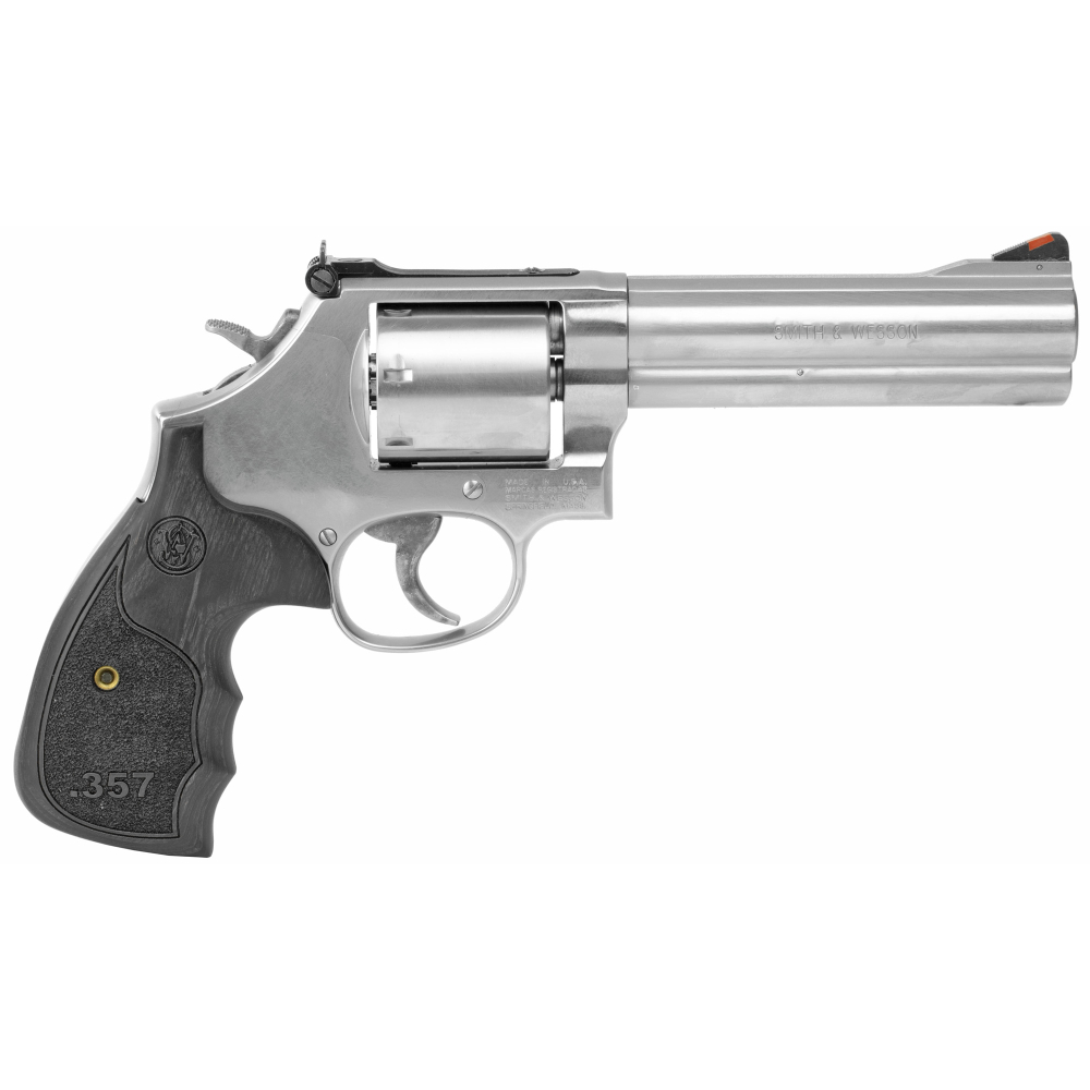 Smith & Wesson 686 Plus, Deluxe, 3-5-7 Magnum Series, Double/Single Action, Metal Frame Revolver, L-Frame, 357 Magnum, 5" Barrel, Stainless Steel, Satin Finish, Silver, Adjustable Sights, Wood Grips, 7 Rounds 150854