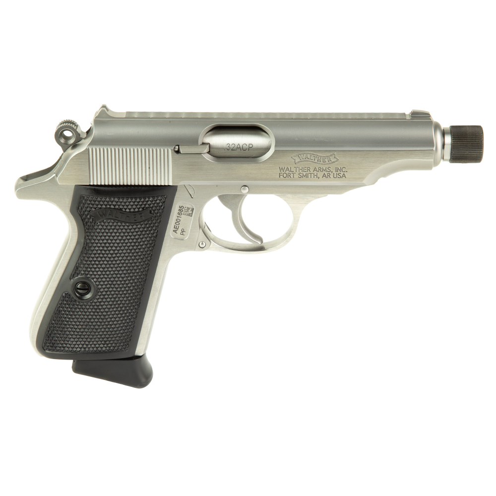 Walther PP SD, Semi-automatic, Double Action/Single Action, Metal Frame Pistol, Compact, 32 ACP, 3.9" Barrel, Threaded 1/2X28, Matte Finish, Silver, Fixed Sights, 8 Round, 2 Magazines 4796062