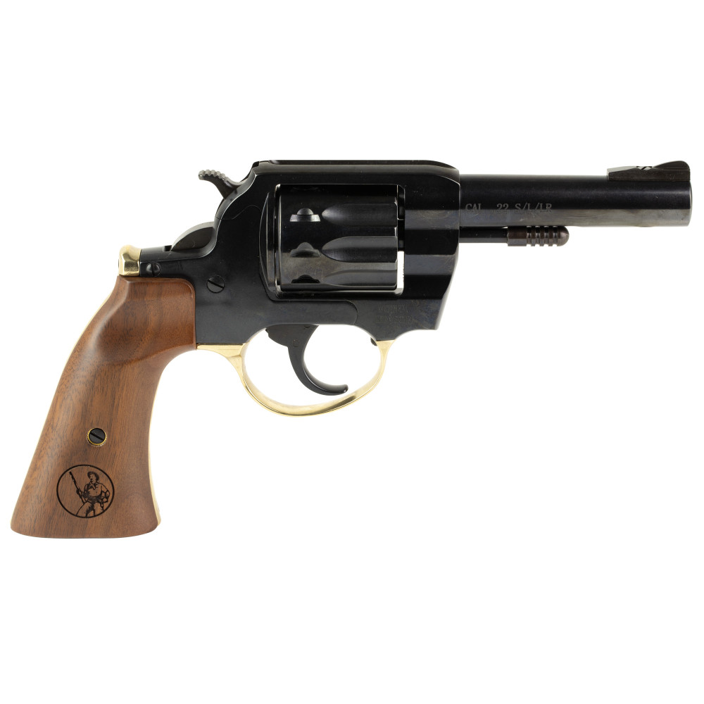 Henry Repeating Arms Golden Boy Revolver, DA/SA, 22 LR, 4" Barrel, Polished Finish, Blue Steel and Brass, American Walnut Gunfighter Grips, Fixed Notch Rear Sight, Screw On Post Front Sight, 10 Rounds H016GD