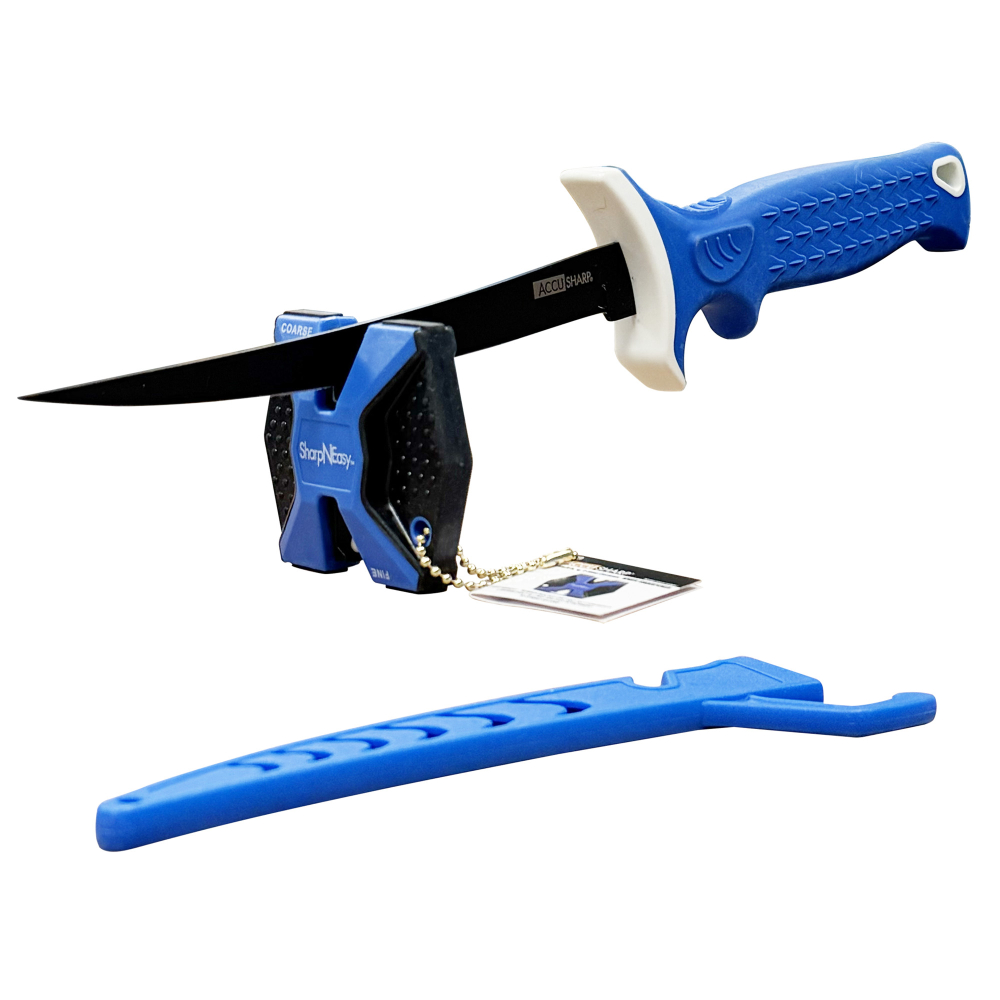 AccuSharp Fillet Knife, Fixed Blade Knife, Blue Non-Slip Grip, Plain Edge, 6.5\" Stainless Steel Blade, Satin Finish, Protective Sheath, Includes AccuSharp Ceramic Knife Sharpener 736C