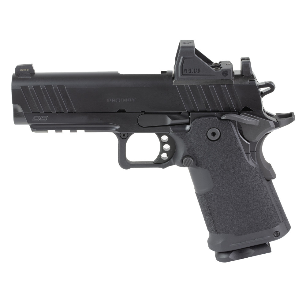 Springfield 1911 DS Prodigy Compact, Semi-automatic, Metal Frame Pistol, 4.25" Stainless Steel Barrel, Aluminum Alloy Frame, Cerakote Finish, Black, Optics Ready, Front White Dot Sight, Viridian Green Dot, 4 Magazines, 15 Rounds, Includes Range Bag PH9116AOS-PAC