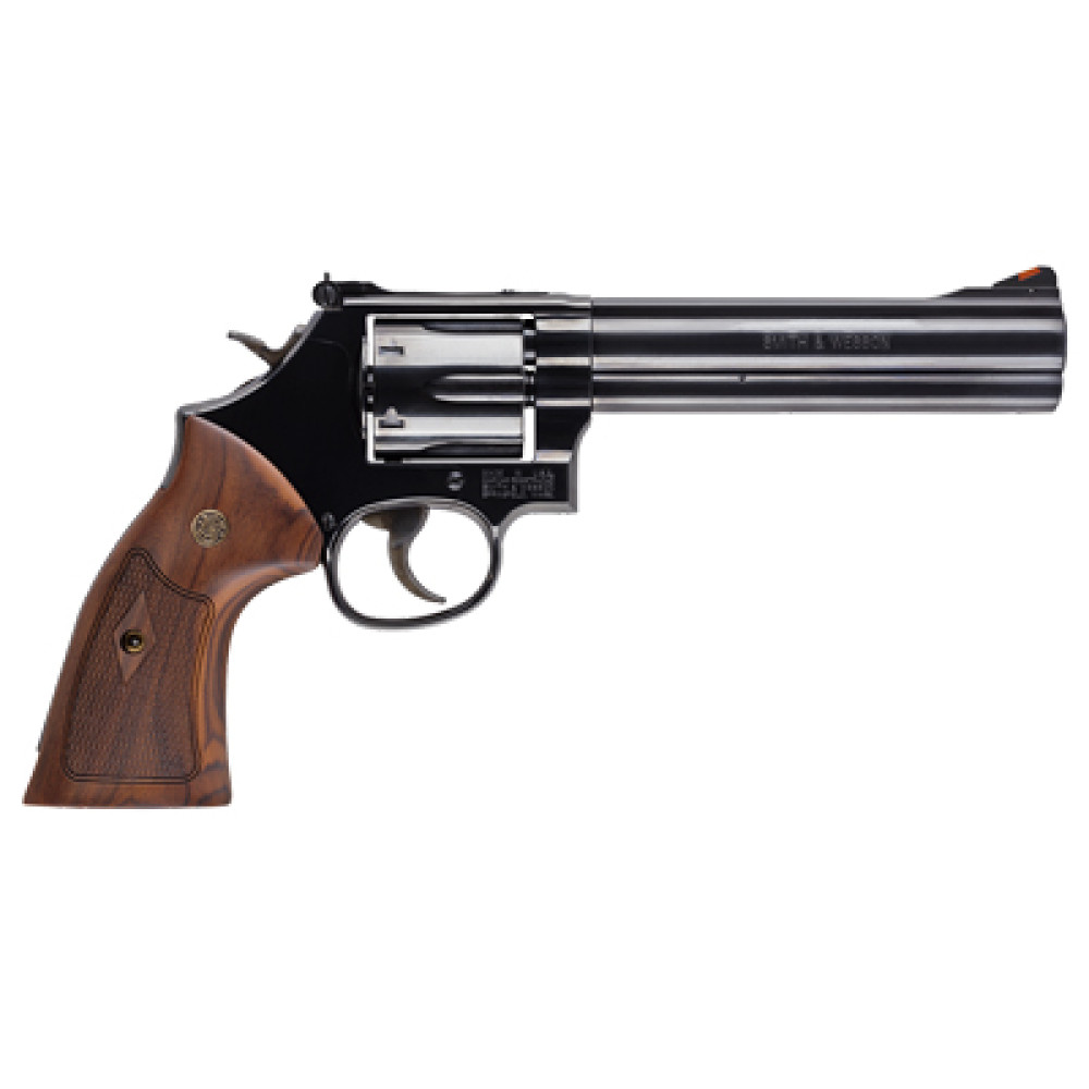 Smith & Wesson Model 586, Classic, Double Action, Metal Frame Revolver, L-Frame, 357 Magnum, 6" Barrel, Carbon Steel, Blued Finish, Wood Grips, Red Ramp White Outline Sights, 6 Rounds 150908