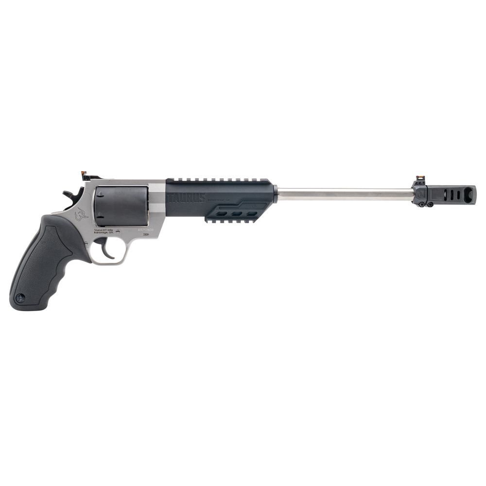 Taurus USA Raging Hunter, Double/Single Action, Large Frame, 350 Legend, 14" Barrel, Matte Finish, Stainless, Two Tone Black and Silver, Muzzle Brake, Picatinny Rail, Black Rubber Grip, Fiber Optic Sights, 6 Rounds 2-350145RH