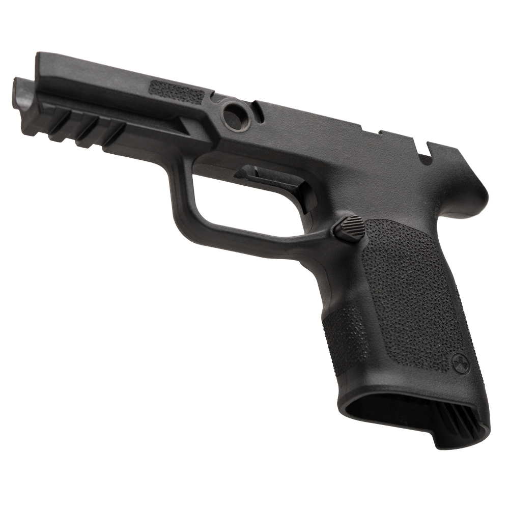 The Magpul EHG SG9 Compact grip frame for the SIG Sauer P320 functions with OEM P320 trigger modules, OEM 15-round magazines and magazine base plates, and small components and accessories. The EHG SG9 features an integral carry-sized magazine well flare and includes a Picatinny rail for lights or lasers. As an added bonus, the frame also comes with the Magpul-designed Magazine Release installed, which is reversible for left-handed shooters. This steel magazine release is finished in QPQ to resist corrosion and wear, and the release's contoured surface features custom jimping to ensure positive engagement with the shooter's finger when changing magazines.