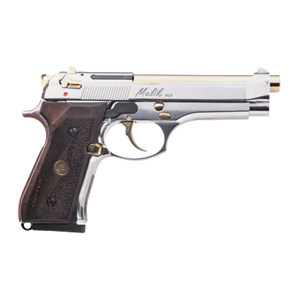 Derya Melik, Double Action/Single Action, Semi-Automatic, Metal Frame Pistol, Full Size, 9MM, 4.9" Barrel, Nickel Finish, Silver, Gold Polished PVC Barrel, Fixed Sights, Slide Mounted Decocker, Mahogany Dark Wood Grips, 10 Rounds, 1 Magazine 10L.MELIK9.NG.TR