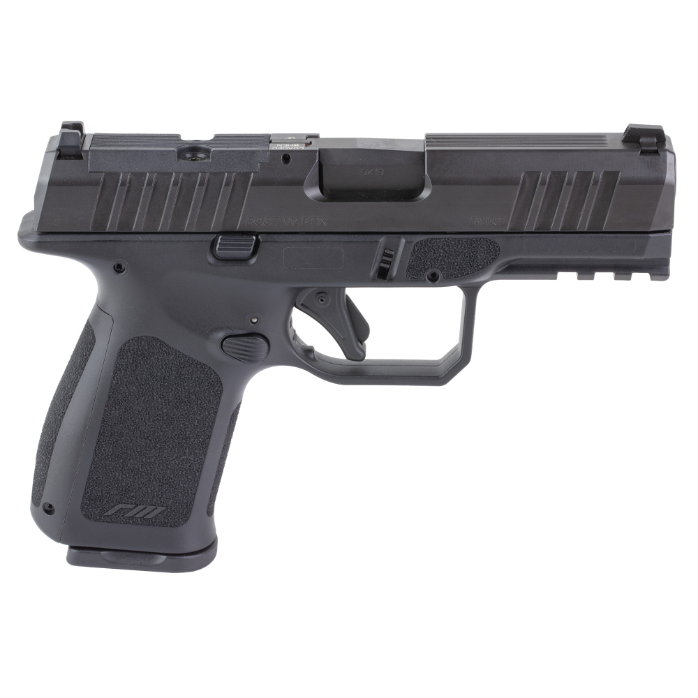 Rost Martin RM1C, Striker Fired, Semi-automatic, Polymer Frame Pistol, Compact, 9MM, 4" Barrel, Nitrocarburized Finish, Black, Front White Dot Sight, Black Serrated Rear Sight, Optics Ready, Ambidextrous, 10 Rounds, Includes RMR Mounting Plate, California Compliant, Savior Specialist Black Pistol Bag, Viridian RFX11 Green Dot Reflex Optic, 1 Flush Mount 10 Round Magazine, 4 Extended 10 Round Magazines RM1CBLKOSP10CA-P