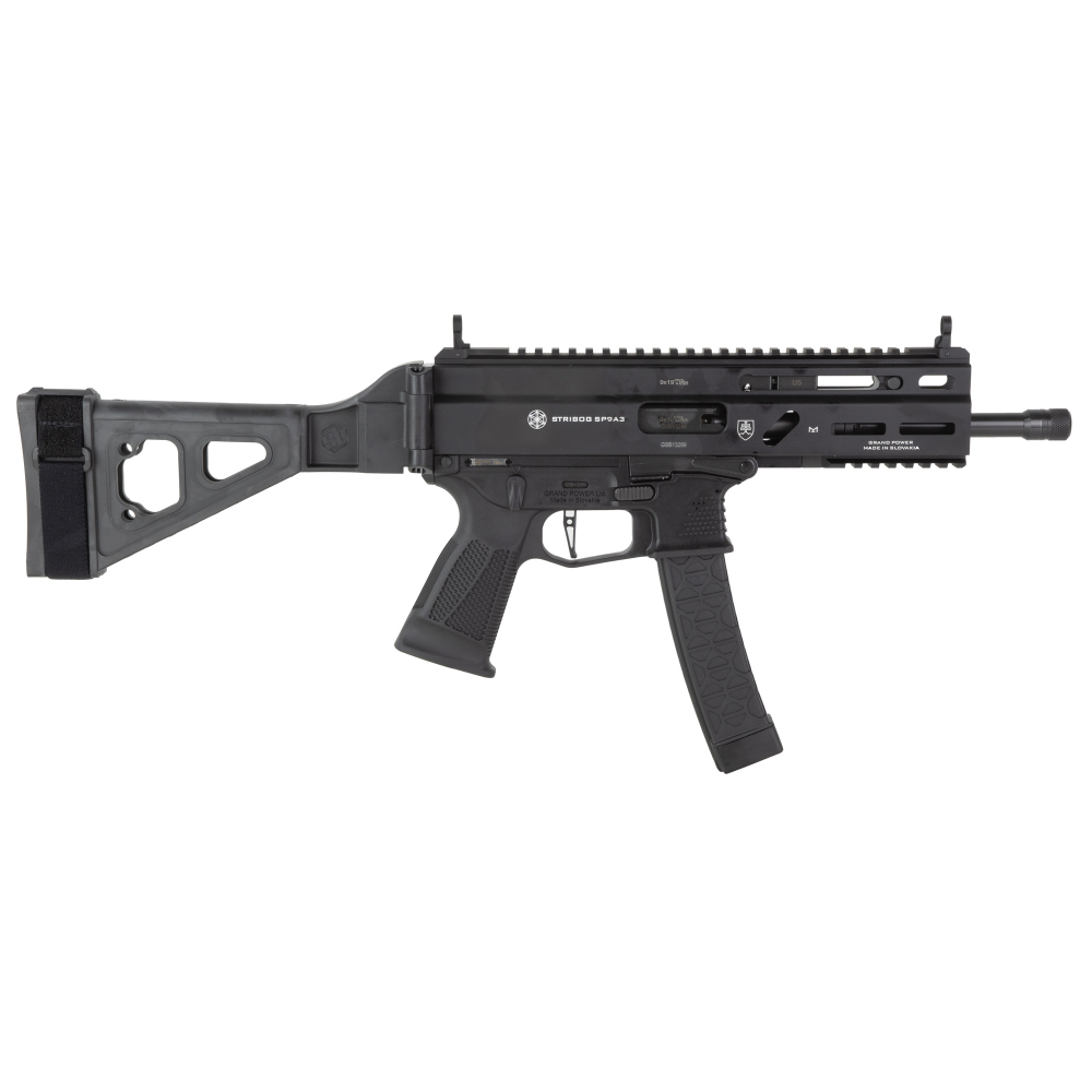 Grand Power Stribog SP9A3, Semi-automatic, Striker Fired, Aluminum Frame Pistol, 9MM, 8" Threaded Barrel, 1/2X28 Thread Pitch, Ambidextrous Controls, Folding Pistol Brace, M-LOK Handguard, Matte Finish, Black, 30 Rounds, 3 Magazines 850003223117