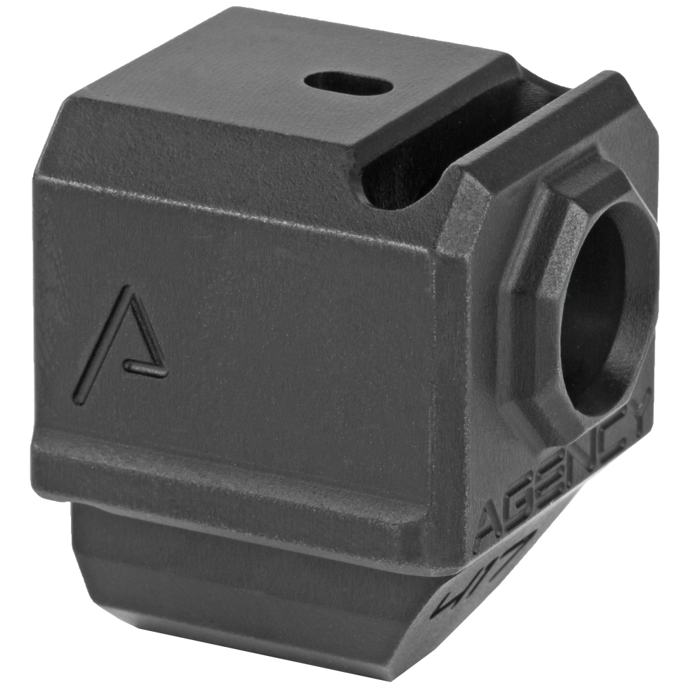 Agency Arms Gen4 Compensator, Features a single top venting port and a front sight hole, Two set screws with an Allen Wrench and a vial of Rockset are included in package, Fits Glock 17/19/34, Standard 1/2X28 thread pitch, Black finish 417S-G4-BLK