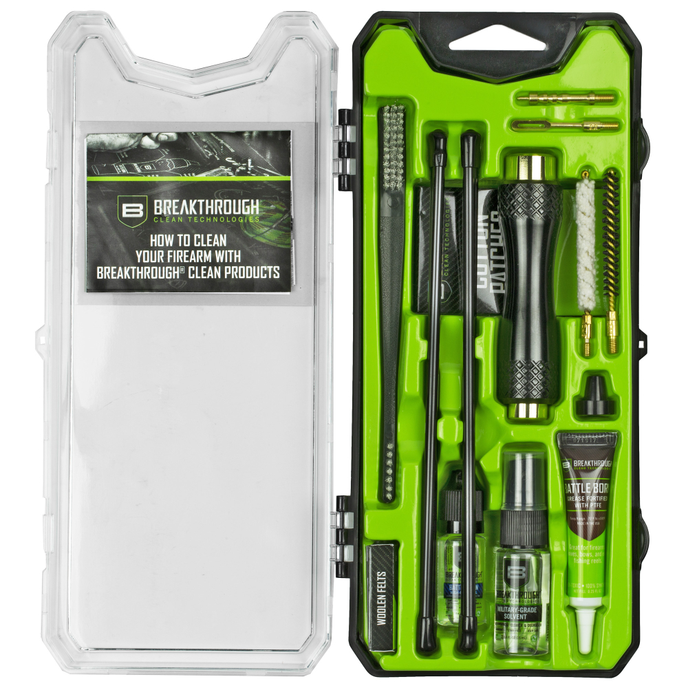 Breakthrough Clean Technologies Vision Series, Cleaning Kit, For .243 Cal/6MM, Includes Cleaning Rod Sections, Hard Bristle Nylon Brushes, Jags, Patch Holders, Cotton Patches, Durable Aluminum Handle And Mini Bottles of Breakthrough Military-Grade Solvent And Battle Born High-Purity Oil BT-CCC-243R