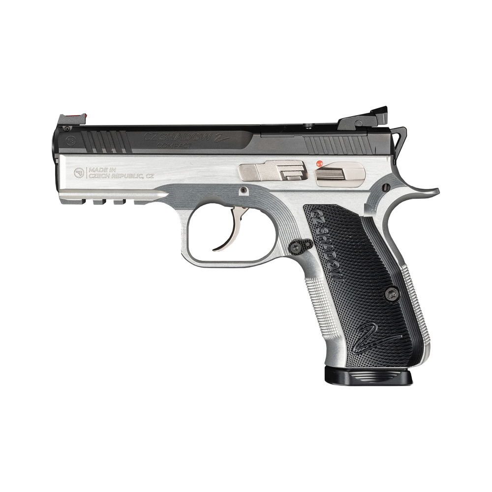 CZ Shadow 2 Compact, Semi-automatic, Single Action/Double Action, Aluminum Frame Pistol, 9MM, 4" Barrel, Polished Finish, Black Slide, Silver Frame, Black Serrated Rear Sight, Fiber Optic Front Sight, Optics Ready, Manual Safety, 15 Rounds, 2 Magazines 86156