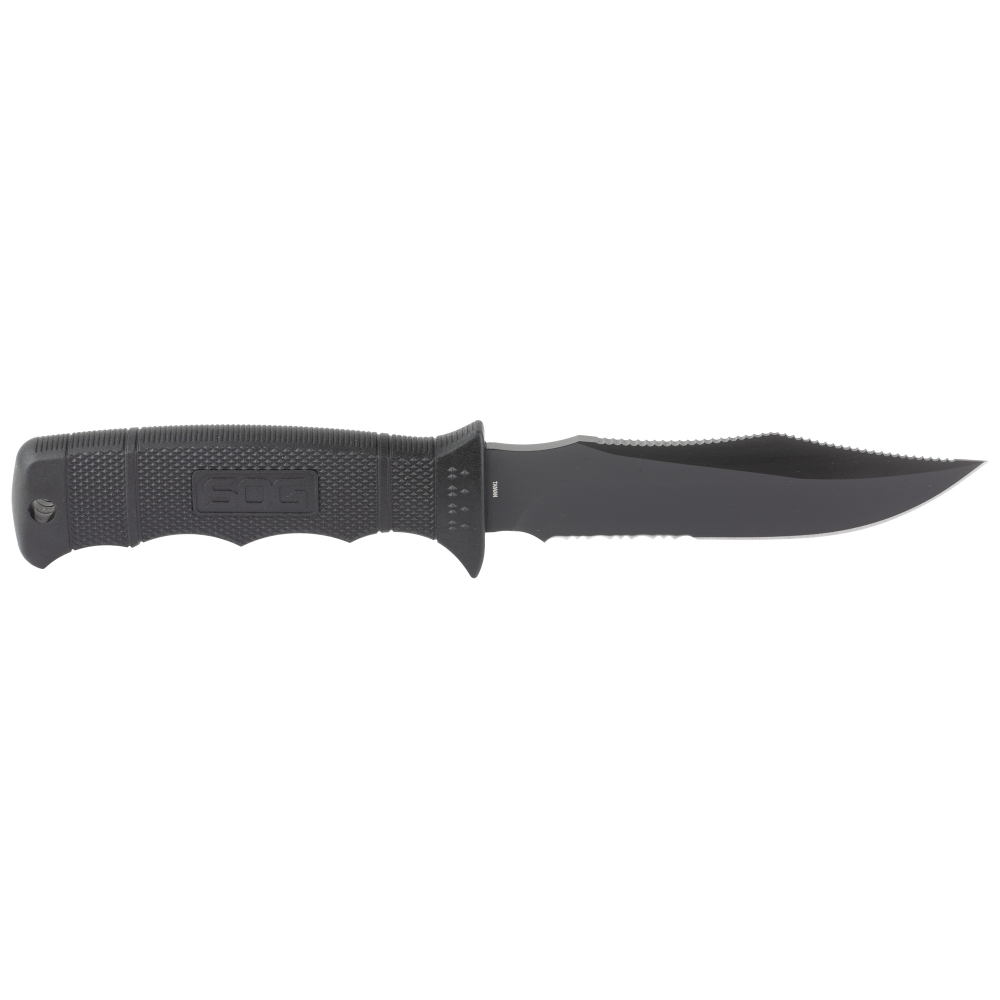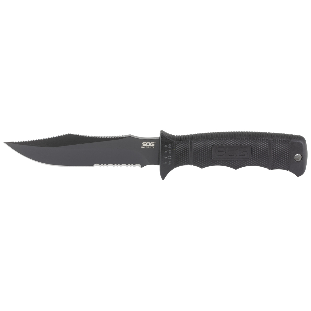 SOG Knives & Tools Seal Pup, Elite, Fixed Blade Knife, 4.85" Clip Point Partially Serrated Edge, Black Glass-Reinforced Nylon Handle, AUS-8 Steel, Hardcased Finish, Black, Includes Kydex Sheath SOG-E37T-K