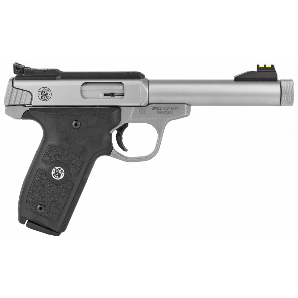 Smith & Wesson SW22 Victory, Single Action Only, Semi-automatic, Metal Frame Pistol, 22LR, 5.5" Threaded Barrel, Stainless Steel, Polymer Grip, Fiber Optic Front Sight, Manual Thumb Safety, Adjustable Rear Sight, 10 Rounds, 2 Magazines 10201