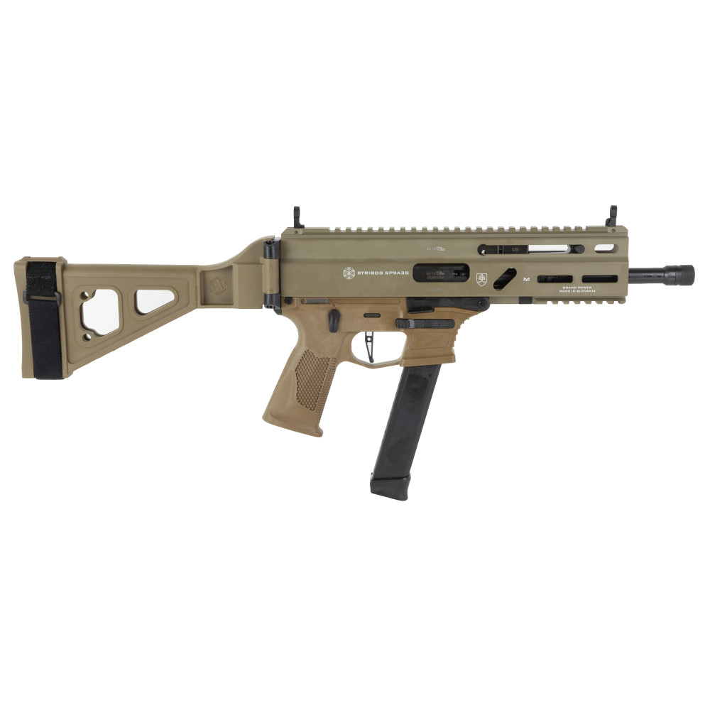Grand Power Stribog SP9A3G, Semi-automatic, Striker Fired, Aluminum Frame Pistol, 9MM, 8" Threaded Barrel, 1/2X28 Thread Pitch, Ambidextrous Controls, Folding Pistol Brace, M-LOK Handguard, Matte Finish, Flat Dark Earth, 33 Rounds, 3 Magazines 197892029995