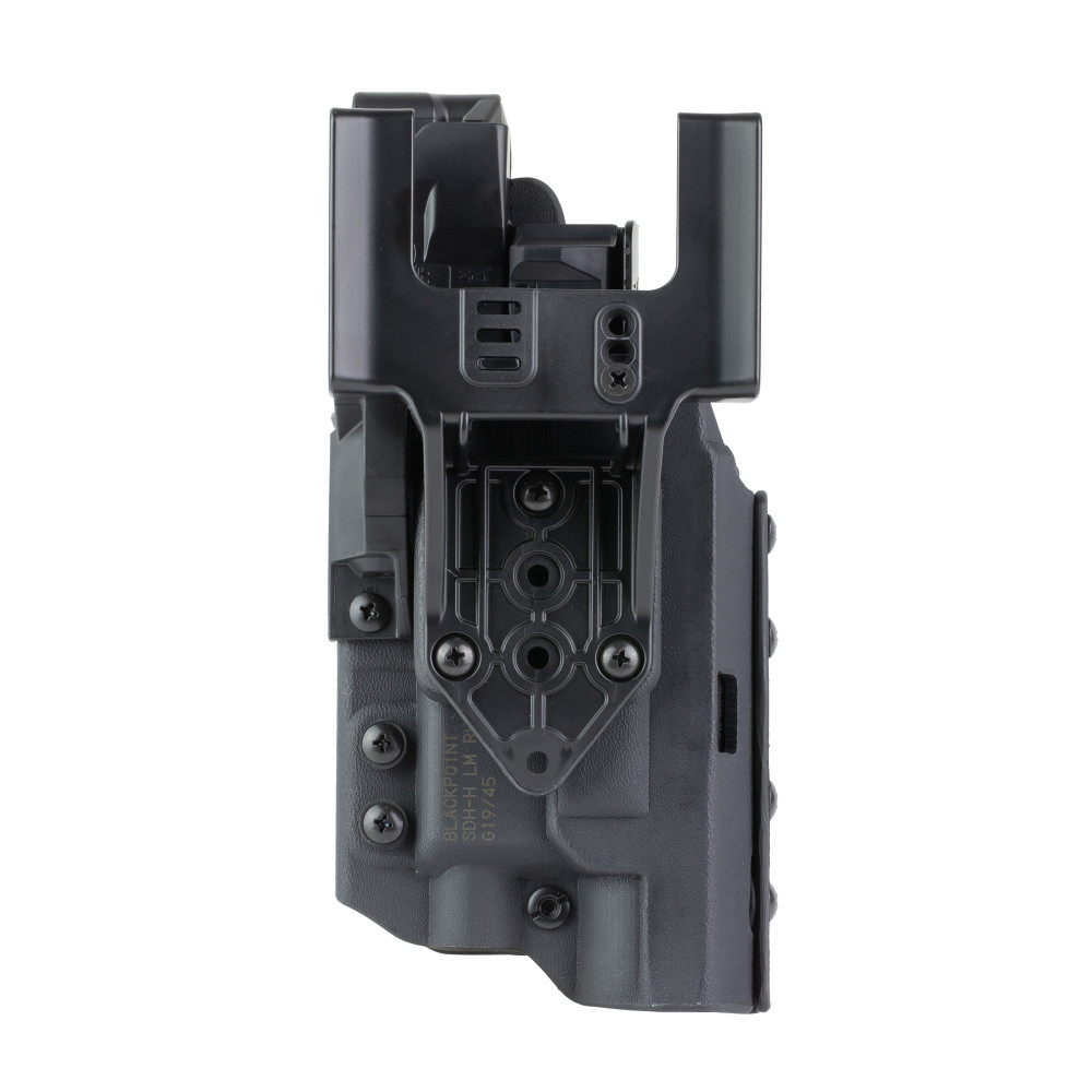 BlackPoint Tactical Slick Dity Light Holster with Hood, Outside Waistband Duty Holster, Fits GLOCK 19/45 with Light, Right Hand, Kydex Construction, Black, Includes (3)-Shims and Drop Offset Mount 185170
