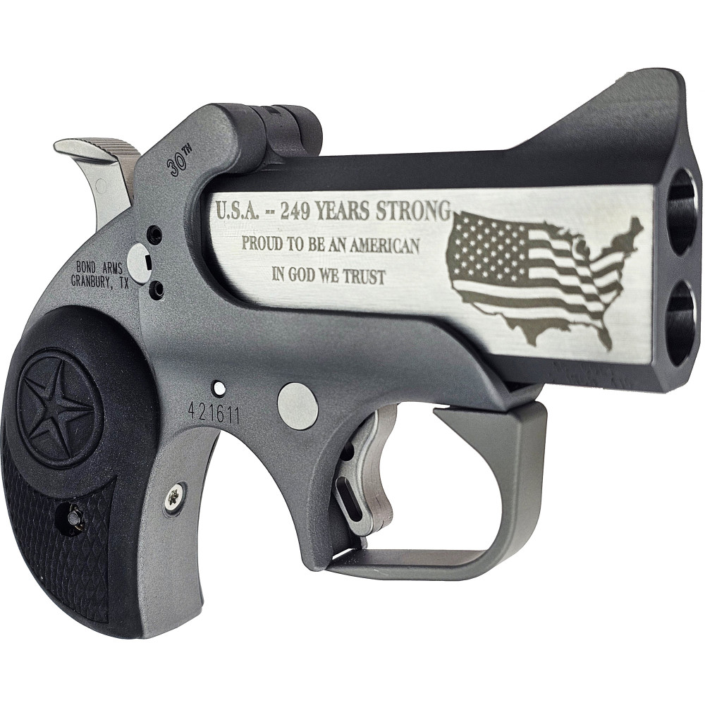 Bond Arms 30th Rough Series, Derringer, 45 Colt/410 Bore, 2.5" Chamber, 3" 30th Anniversary Engraved Flat Barrel, Stainless Steel, Silver, Black Rubber Grips, Fixed Sights, 2 Rounds, With Trigger Guard BA30TH-45LC-410