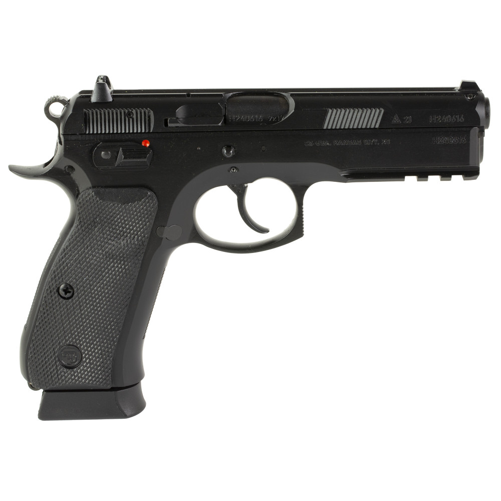 The CZ 75 SP-01 is the first full size handgun (4.6" bbl) from CZ to feature the improved manufacturing technology and ergonomics of the NATO-approved CZ 75 Compact P-01 model. Featuring an integral 1913 accessory rail on the dust cover, rubber grip panels, and CZ's corrosion resistant black polycoat finish, the SP-01 is the newest model to join the family of pistols based on the CZ 75 (SA/DA) platform. Borrowing from the improved grip geometry of the compact P-01, the SP-01 utilizes an extended beavertail to protect shooter's strong hand as well as allowing for a deeper and more secure grip. The new grip geometry, checkering in key areas on the front and back straps, and redistribution of mass provided by the accessory rail noticeably decrease the perceived recoil from previous models and allows for more rapid target acquisition and transition. This model has a manual safety.