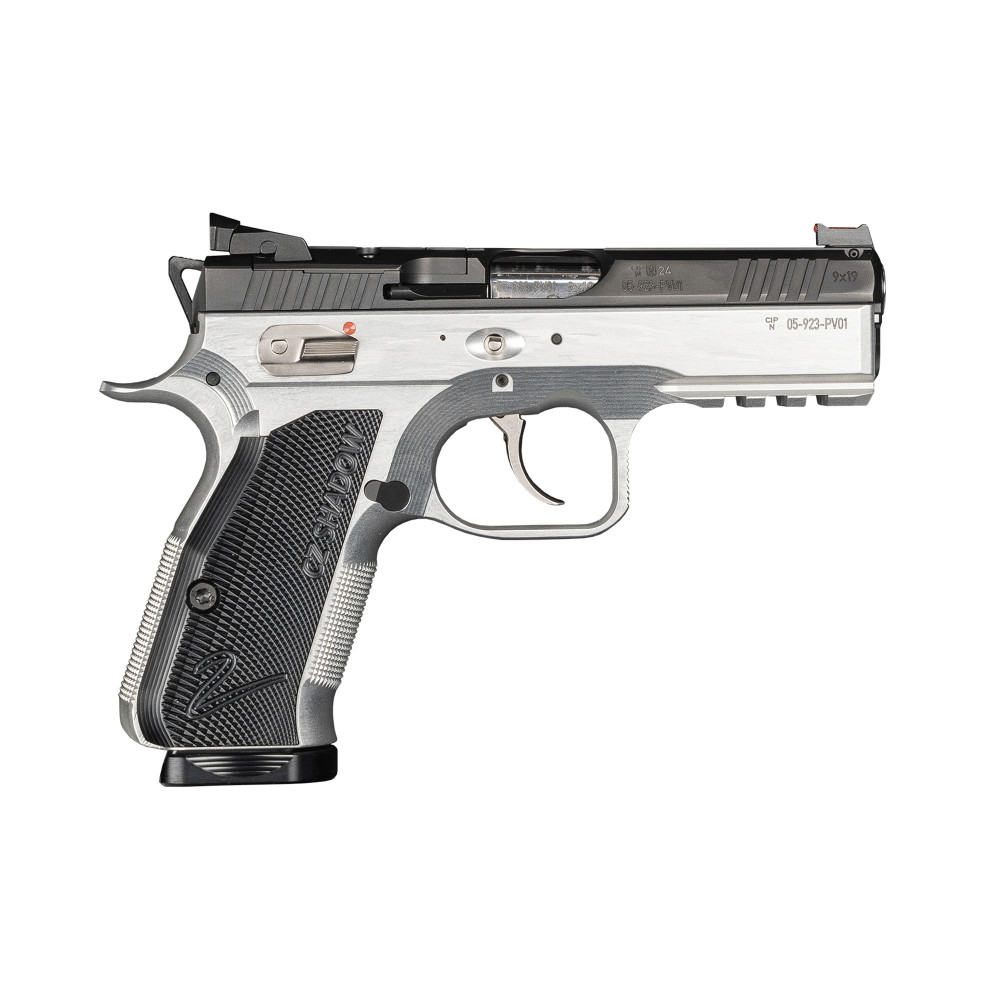 CZ Shadow 2 Compact, Semi-automatic, Single Action/Double Action, Aluminum Frame Pistol, 9MM, 4" Barrel, Polished Finish, Black Slide, Silver Frame, Black Serrated Rear Sight, Fiber Optic Front Sight, Optics Ready, Manual Safety, 15 Rounds, 2 Magazines 86156
