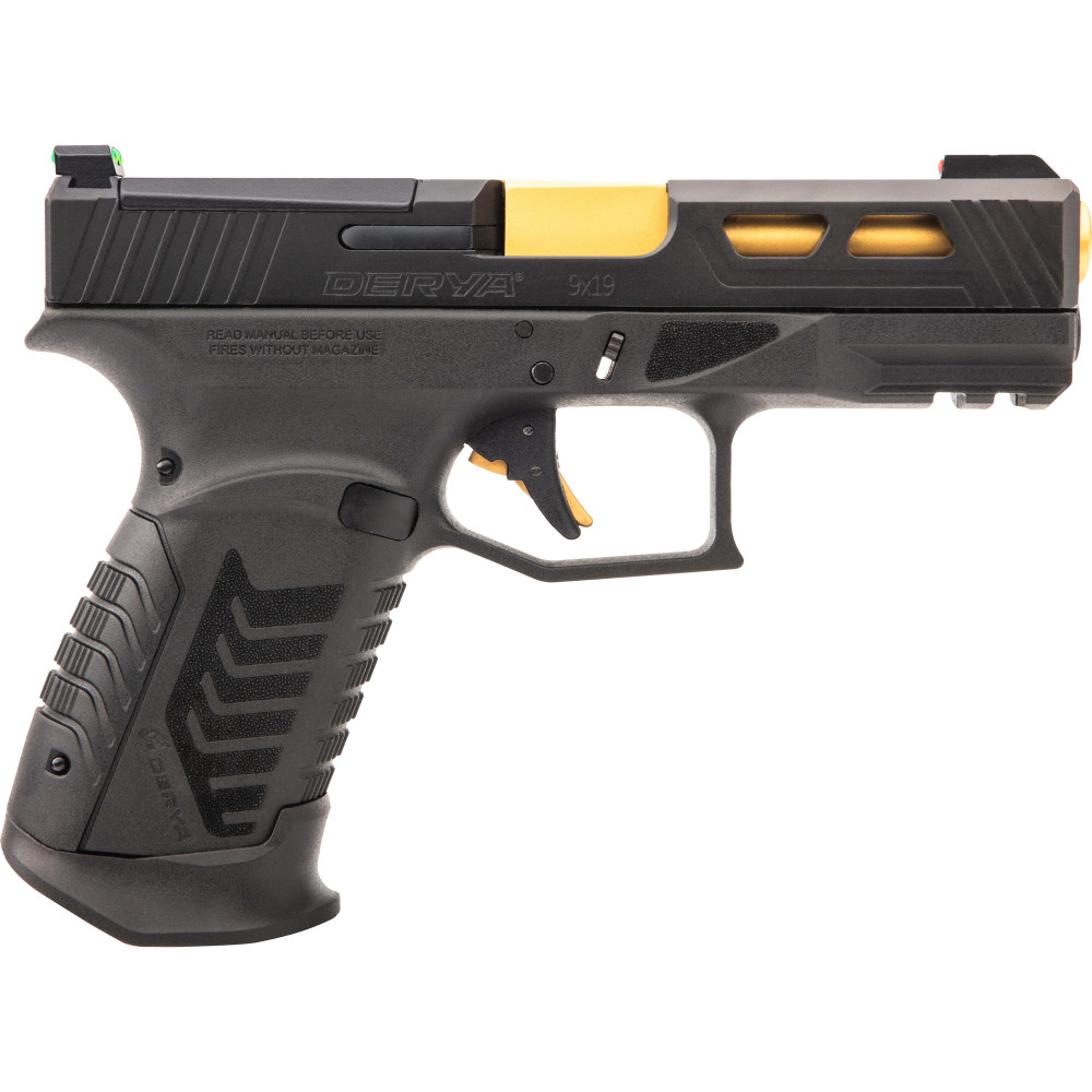 Derya DY9, Striker Fired, Semi-automatic, Polymer Frame Pistol, Full Size, 9MM, 3.86" Barrel, PVD Finished Gold Barrel, Melonite Finish, Black, Truglo Fiber Optic Front and Rear Sights, Optics Ready Slide, Glock Magazine Compatible, 15 Rounds, 1 Magazine, Includes (2) Optic Plates & (4) Back Straps DY9.G.US