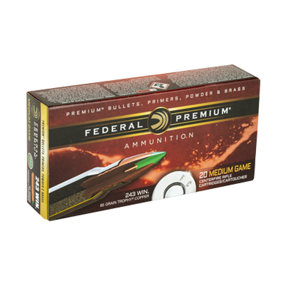 Federal Premium, 243 Win, 85 Grain, Trophy Copper, Lead Free, 20, Round Box, California Certified Nonlead Ammunition P243TC1