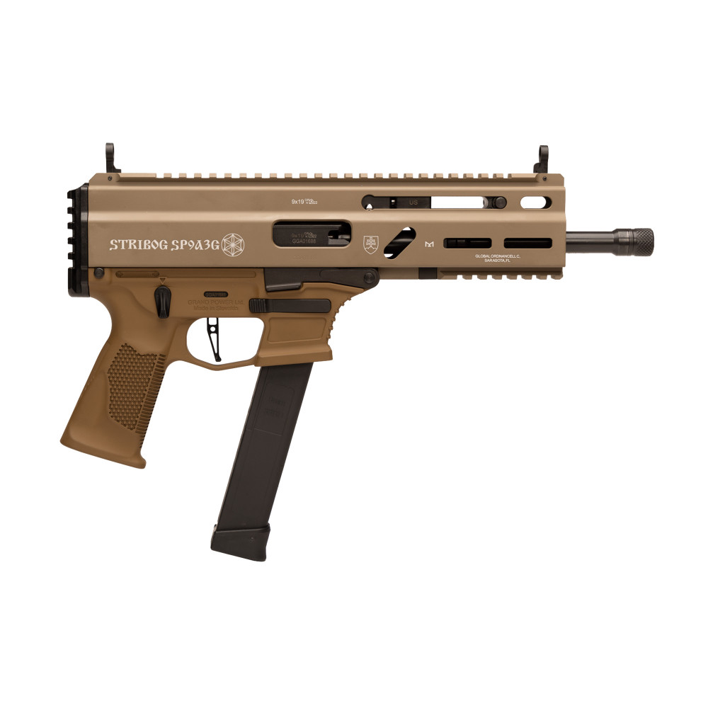 Grand Power Stribog SP9A3G, Semi-Automatic Pistol, 9MM, 8" Threaded Barrel, Aluminum Frame, Non-Reciprocating Charging Handle, M-LOK Rail, Compatible with Glock Style Magazines, Matte Finish, Flat Dark Earth, 33 Rounds, 3 Magazines, Plastic Hard Case GRP810091156155