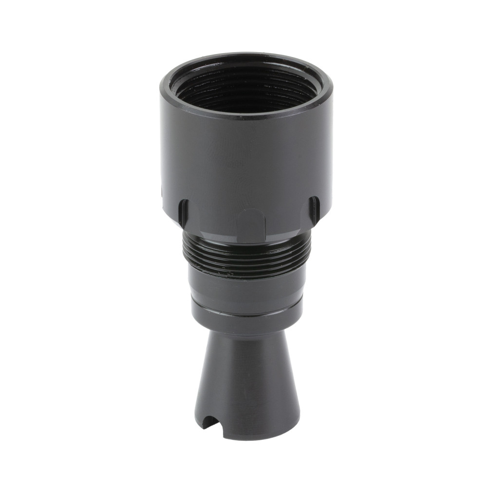 Plan B muzzle devices feature a taper followed by threads, resulting in repeatable lockup and a proper seal between the muzzle device and suppressor adapter. These Plan B muzzle devices are compatible with Plan B suppressor hubs. It is recommended to use Rocksett for installation and 20-25 ft-lbs of torque. Some suppressor manufacturers will not honor warranty claims if other brands of muzzle devices are used with their suppressors.