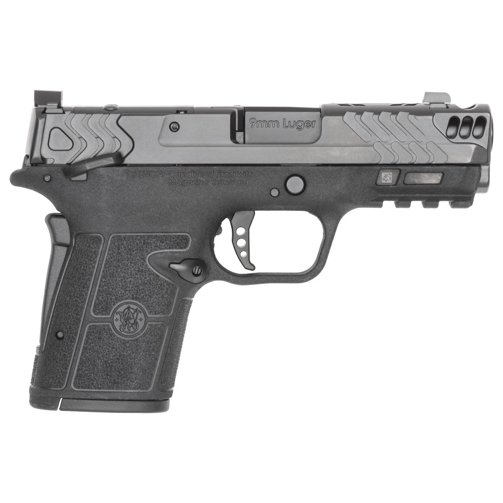 Smith & Wesson Performance Center Equalizer Carry Comp, Semi-automatic, Striker Fired, Micro-Compact, Polymer Frame Pistol, 9MM, 3.675" Ported Barrel, Armornite Finish, Black, Textured Polymer Grips, Blacked-out U-Notch Rear Sight, Ameriglo Trooper Tritium Front Night Sight, Optic Ready Slide, Grip Safety, Ambidextrous Thumb Safety, 15 Rounds, (3)-Magazines, (1)-15 Round, (1)-13 Round and (1)-10 Round Magazine 14411