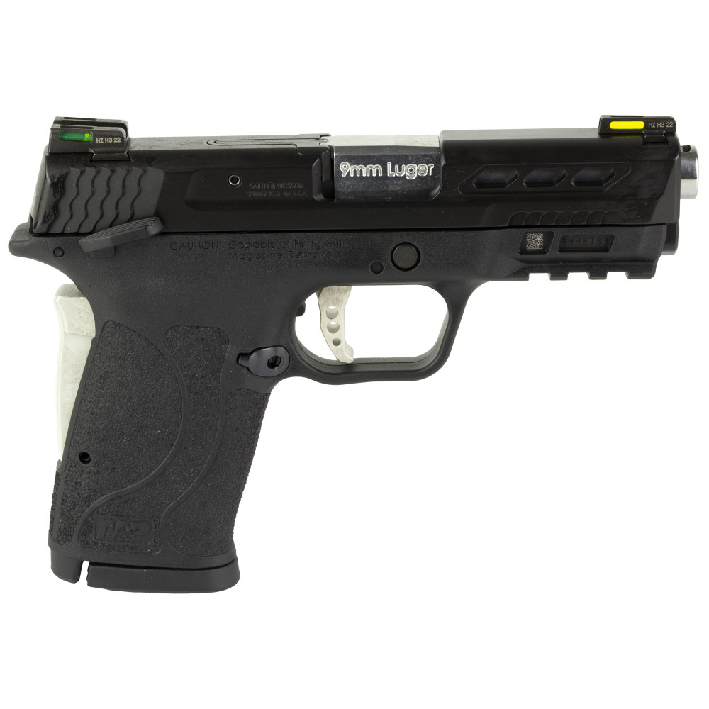 Smith & Wesson M&P9 Shield EZ, Performance Center, Internal Hammer Fired, Semi-automatic, Polymer Frame Pistol, Micro-Compact, 9MM, 3.8" Ported Barrel, Armornite Finish, Black Frame with Silver Accents, HiViz Litewave H3 Tritium/Lightpipe Sights, Manual Thumb Safety, 8 Rounds, Performance Center Aluminum Trigger, 2 Magazines 13225