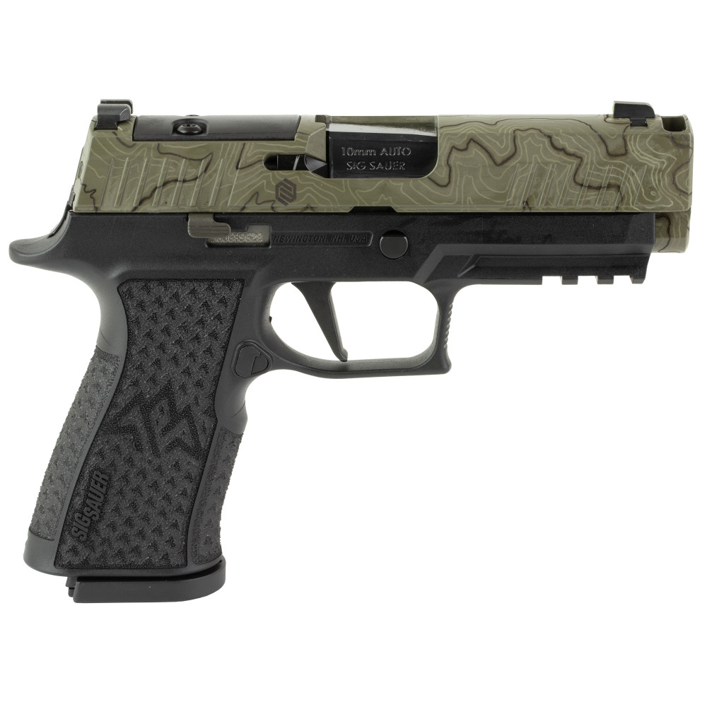 Sig Sauer P320, XTEN Endure Comp, Striker Fired, Semi-Automatic, Polymer Frame Pistol, 10MM, 3.8" Barrel with Integral Port, Cerakote Finish, Moss Green Slide with Topographic Laser Etched Pattern, Black Frame, Optics Ready, XRAY3 Day/Night Sights, 15 Rounds, 3 Magazines 320XCA-10-COMP-CW