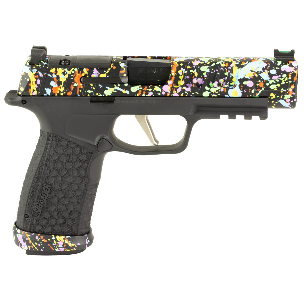 Sig Sauer P365 Fuse, Semi-automatic, Polymer Frame Pistol, Compact, 9MM, 4.3" Barrel, Custom SKYDAS Cerakote Finish, Custom Black 80s Retro Neon Splatter, Fiber Optic Front and Low Profile Combat Rear Sights, 3 Magazines, (2)-21 Round Magazines and (1)-17 Round Magazine 365XF-9-BFO-SPLATSKY