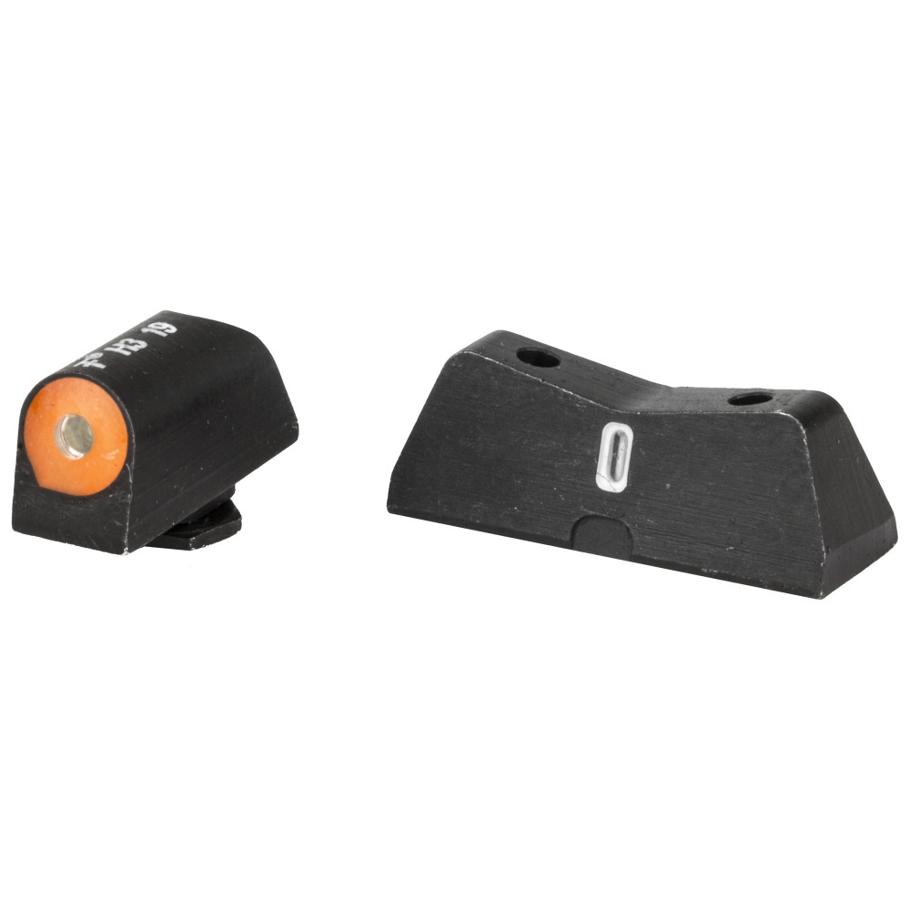 XS DXT2 Big Dot Night Sights provide the best front sight visibility in all lighting conditions. DXT2 Big Dot sights focus attention on the front sight by using a high-contrast front and a V-notch rear for an unobstructed view. The front sights feature a patent-pending glow dot that absorbs light and glows in low light before it becomes dark enough to see the tritium. Optic Orange is designed to deliver a high-contrast sight picture in bright conditions and maintain visibility as light diminishes. To ensure visibility in low light when uncharged, optic orange mainly relies on yellow with a touch of red. The larger surface area of the convex dot enhances light absorption, boosting the glow's brightness. The "dot-the-i" sight picture, with a tritium dot on the front sight and a tritium bar on the rear, helps prevent confusion of the sights during high-stress situations. The wide field of view improves visibility of both the front sight and the threat downrange.