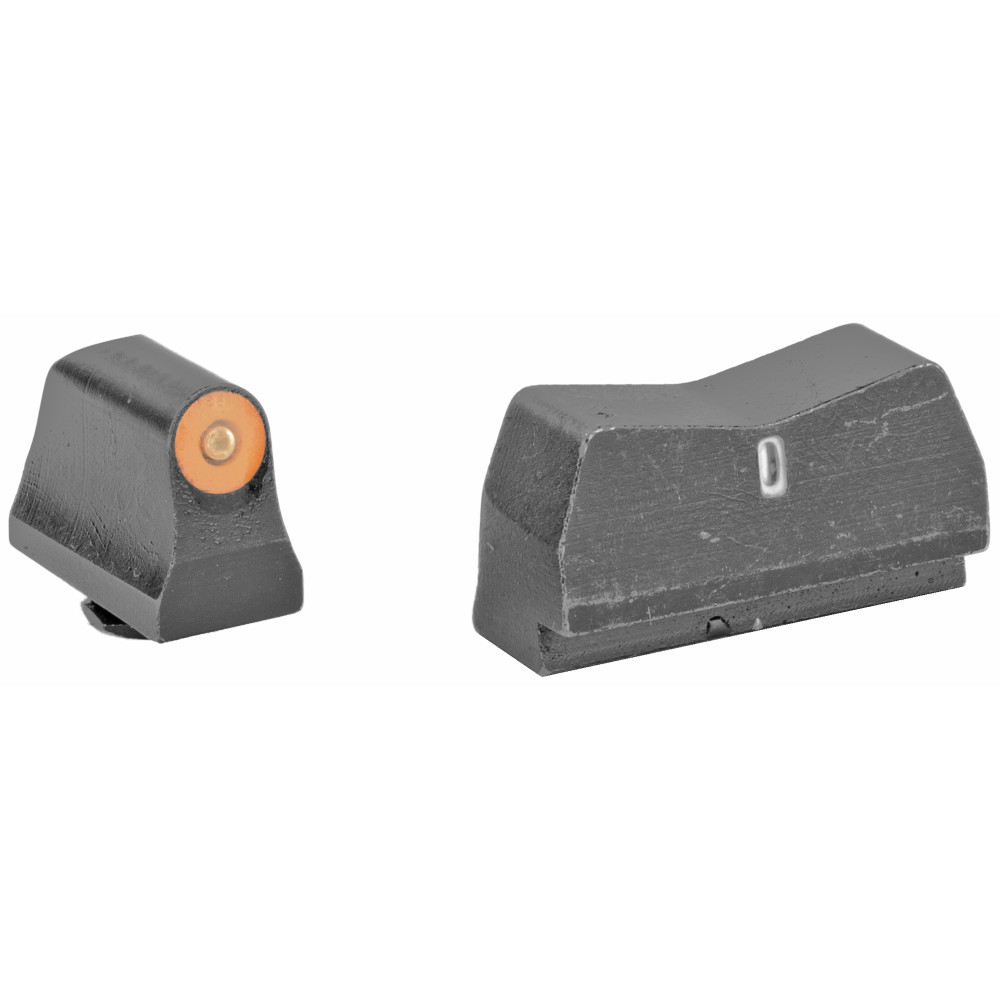XS DXT2 Big Dot Night Sights provide the best front sight visibility in all lighting conditions. DXT2 Big Dot sights focus attention on the front sight by using a high-contrast front and a V-notch rear for an unobstructed view. The front sights feature a patent-pending glow dot that absorbs light and glows in low light before it becomes dark enough to see the tritium. Optic Orange is designed to deliver a high-contrast sight picture in bright conditions and maintain visibility as light diminishes. To ensure visibility in low light when uncharged, optic orange mainly relies on yellow with a touch of red. The larger surface area of the convex dot enhances light absorption, boosting the glow's brightness. The "dot-the-I" sight picture, with a tritium dot on the front sight and a tritium bar on the rear, helps prevent confusion of the sights during high-stress situations. The wide field of view improves visibility of both the front sight and the threat downrange.