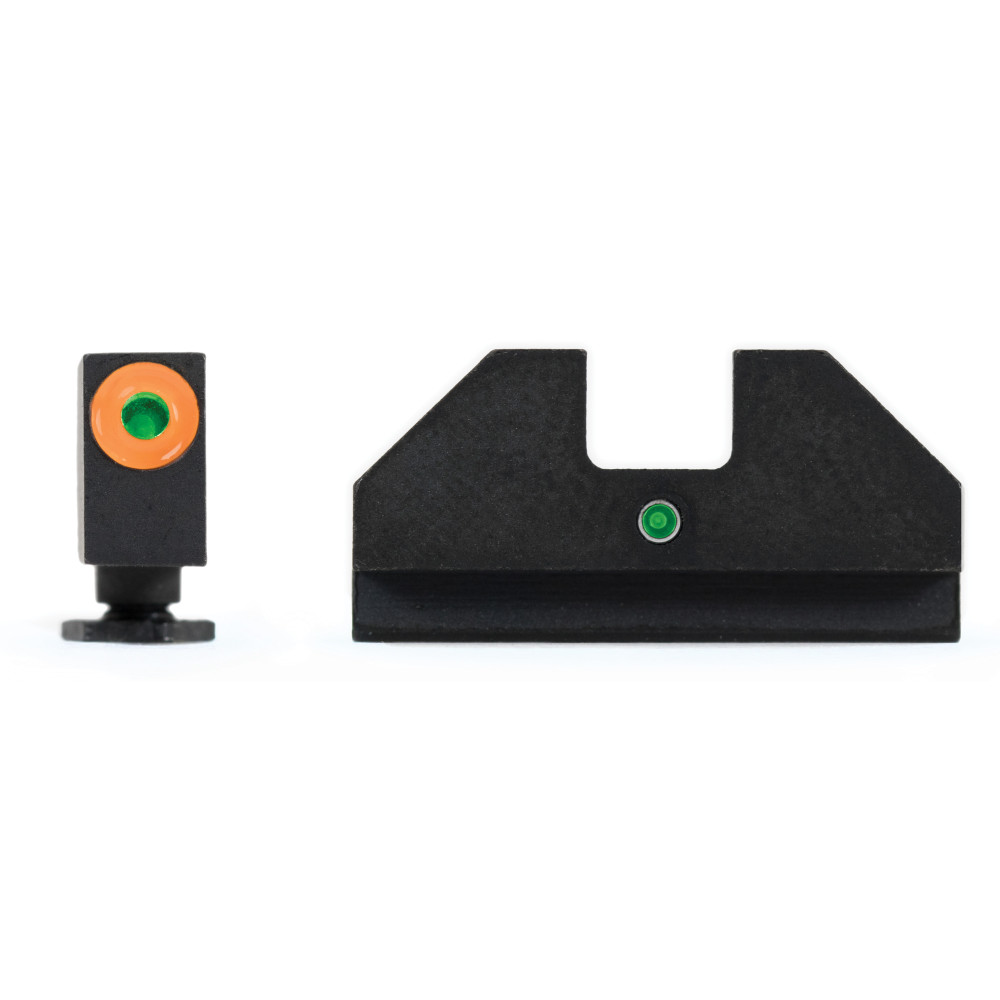 Shoot better day and night. XS F8 night sights increase front sight focus by using a large, high-contrast front sight for fast sight acquisition. The wide notch rear sight easily aligns with the front sight and increases front sight visibility. XS F8 night sights give you the best notch and post solution for fast sight acquisition in all lighting conditions. Green tritium in front and rear glow in low light to aid in sight alignment. Highly visible orange ring is designed for maximum visibility in bright to low light levels, with photoluminescent particles absorbing ambient light to glow in low light. Base of notch in rear sight is rounded to draw focus to the top edge of the sights to aid in proper alignment. Rear sight overhangs back toward shooter to reflect glare down away from the shooter's eye. Rear sight ledge for one-handed slide manipulations. Fits in common holsters. Install by hand or sight pusher tool. Fits Glock models 20, 21, 29, 30, 30S, 37, 40, & 41.