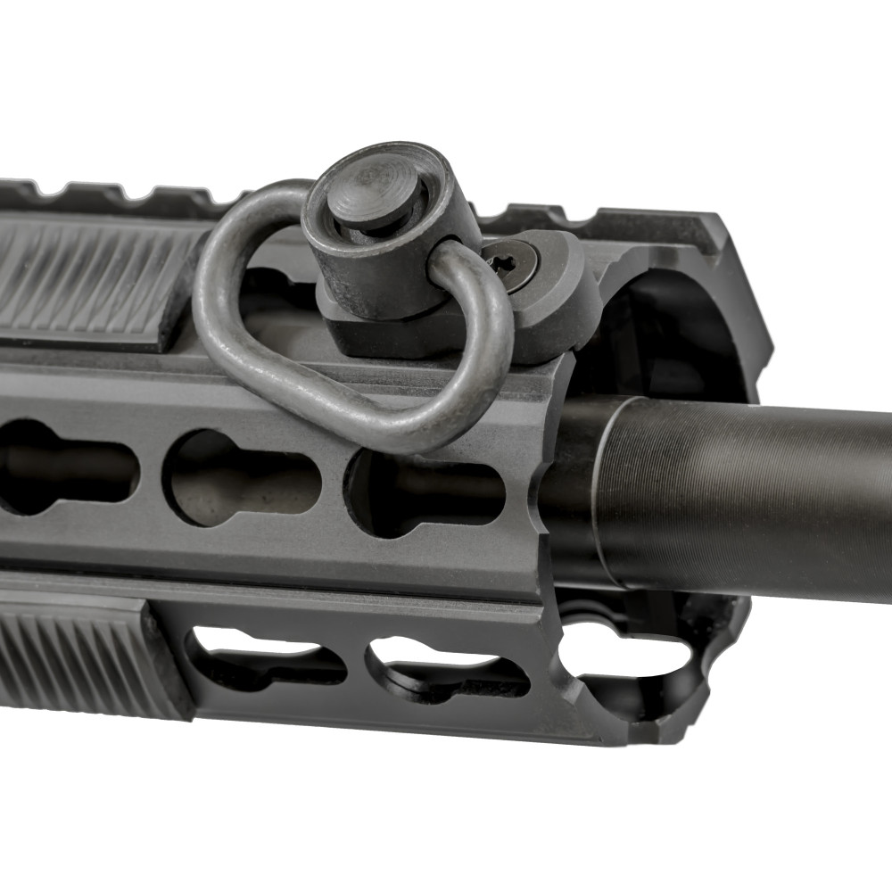 This Q.D. Sling Swivel is standard size and fits many other applications, with just the push of a button, you can easily attach this sling mount . It Holds strong until the button is pushed to release.